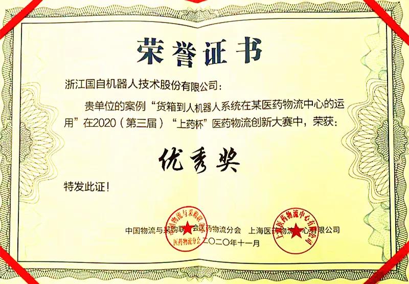 2020年11月20日,2020(第三屆)“上藥杯”全國醫藥物流創新大賽在第七屆中國醫藥物流行業年會上隆重揭曉并舉行了頒獎儀式,國自機器人憑借“貨箱到人機器人系統在某醫藥物流中心的應用”案例榮獲本次大賽優秀獎。